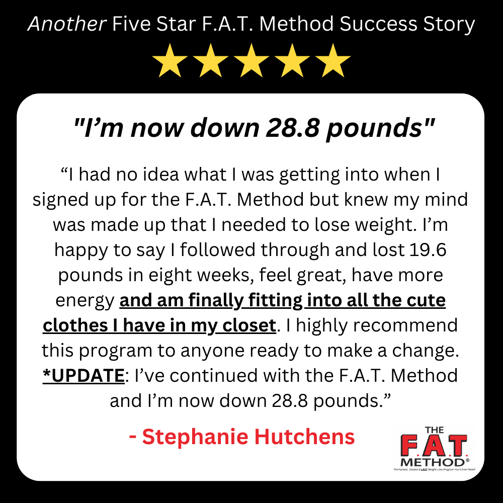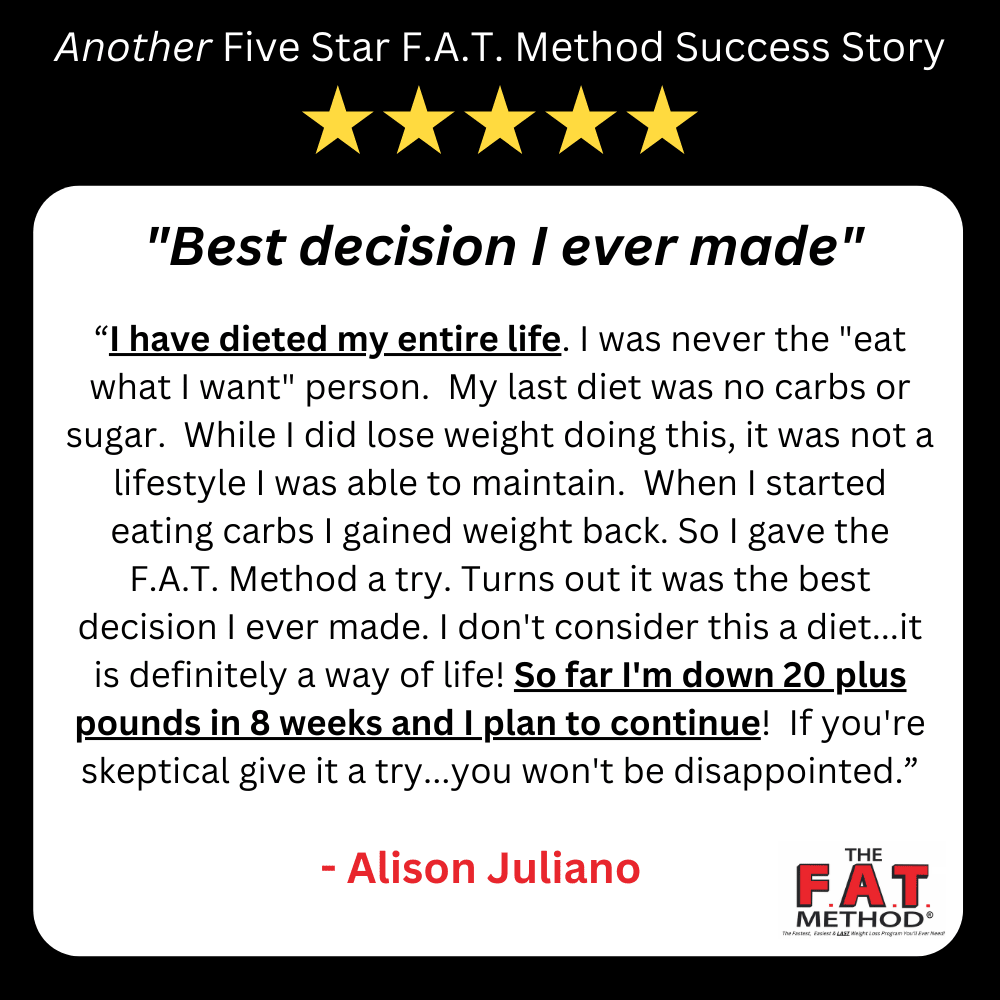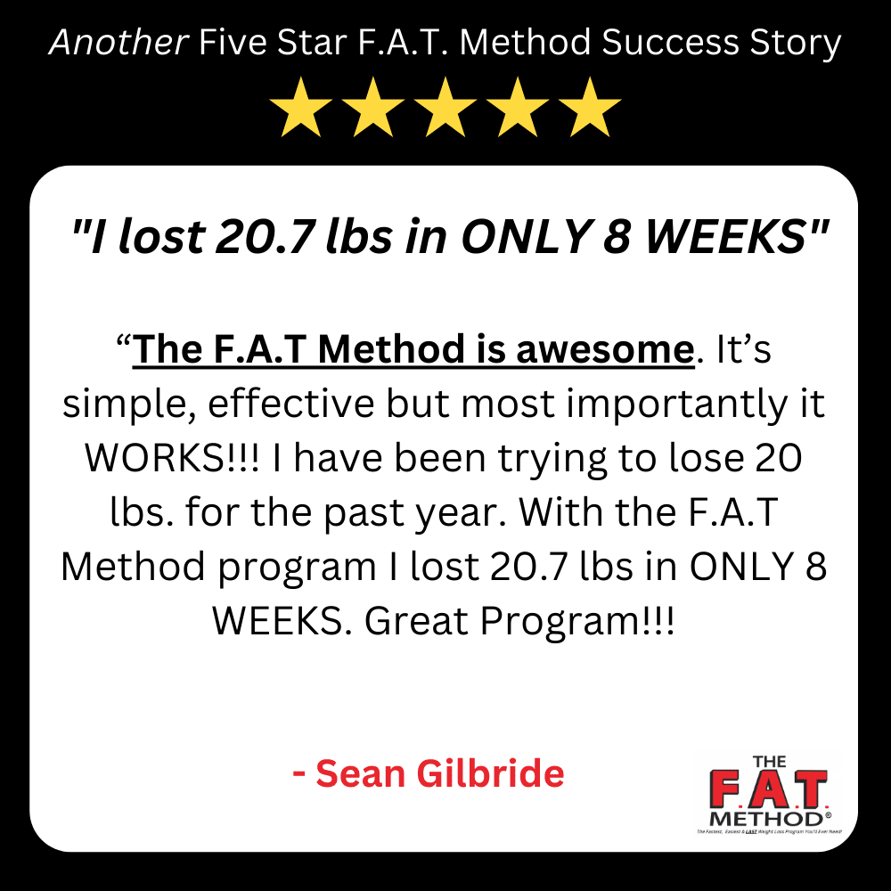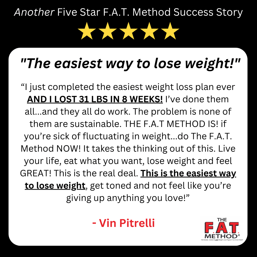 And no more Yo-Yo’ing! The F.A.T. Method is truly SUSTAINABLE. Something you can do for life. Because it’s simple and healthy. And it makes you look and feel great.